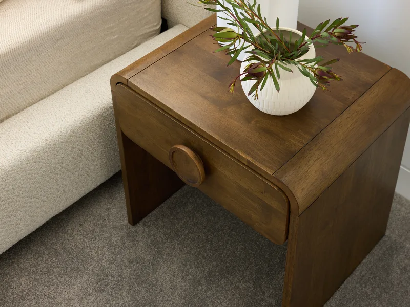 Bringing soft curves and timeless warmth to a space. With its rounded edges, rich walnut finish, and elegant silhouette, it perfectly balances modern design with everyday function. A compact form with a single drawer keeps essentials neatly tucked away.